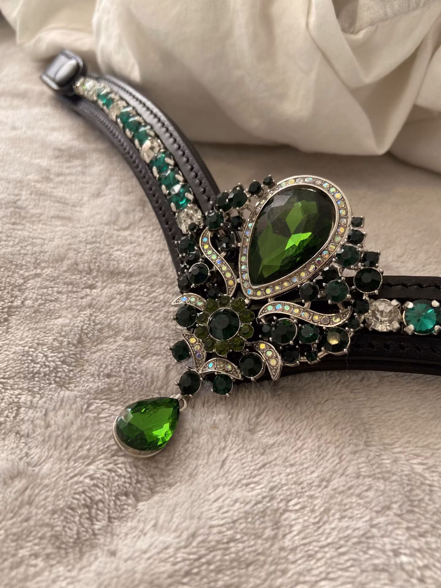 - Sista bilden är pannband med rhinestone emerald. Infatttningslänken och smycket kommer också från oss